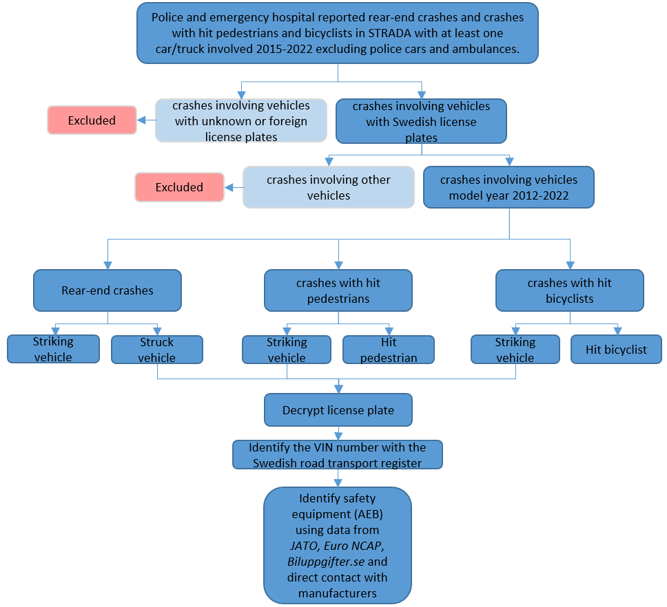 AEB with pedestrian and/or cyclist detection is standard in some car models and optional in others, depending on the model and year. To collect this information, ethical approval was obtained to access individual vehicle data, including registration numbers, from STRADA. Information such as car brand, model number, and model year was used to check the cars obtained from STRADA against Folksam’s vehicle records to determine if they have AEB as standard or optional. Cars with optional installation of these systems were verified against individual vehicle equipment lists via the website biluppgifter.se, using manufacturer codes identified through registration numbers obtained from STRADA. For more information about the evaluation process, see the flowchart illustrated in the Appendix.